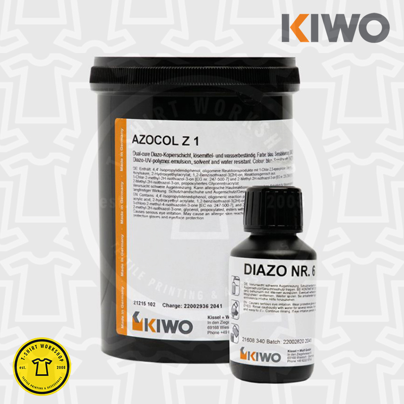 U našoj ponudi repromaterijala uz kvalitetne Feteks boje nudimo i Kiwo Azocol Z1 Sito Emulzija za izradu predložaka za tisak na vašoj sitotiskarskoj svili. Naša popularna visokokvalitetna diazo foto emulzija savršeno je rješenje za linijske, grafičke i polutonske otiske s tintama od plastizola i agresivnim bojama na bazi otapala. Ovaj proizvod odlikuje visoka rezolucija, izvrsna oštrina rubova i vrlo dobar mrežasti prijelaz. Diazo-UV-polimerna foto-emulzija otporna na otapala i vodu. AZOCOL Z 1 koristi se za izradu visokokvalitetnih šablona otpornih na otapala i vodu. Univerzalno pogodan za gotovo sve primjene u sitotisku. Visoka vlažnost zraka gotovo ne utječe na otpornost tinte.